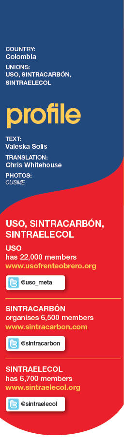said the executive committees of SINTRAELECOL, USO and SINTRACARBÓN a joint statement last year. A coordinating body, CUSME, has since been formed to support the merger. Colombia’s anti-trade union climate has led the unions to focus on building strength. Over the years, the three unions have been put to the test with a number of conflicts; SINTRACARBÓN’s struggle against Carbones del Cerrejón Limited and Prodeco at the Calenturitas mine has seen the trade union defending the rights of workers as well as the residents of local communities affected by mining operations; SINTRAELECOL has battled persecution and threats against workers in the electricity sector; while USO has fought against political persecution and violation of labour rights by Pacific Rubiales.