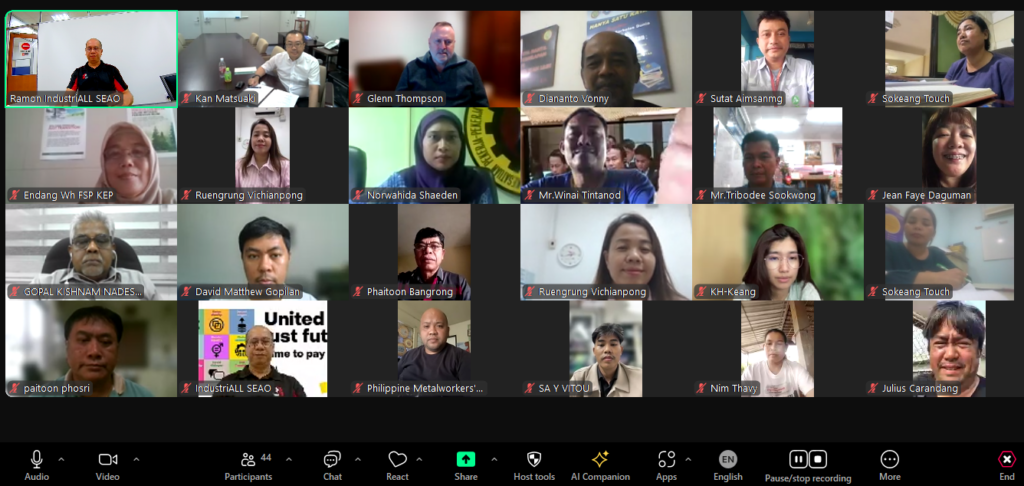 During the virtual IndustriALL regional meeting on Industry 4.0, 40 trade unionists from Australia, Cambodia, Indonesia, Korea, Malaysia, the Philippines, and Thailand shared their views on industry transformation in the region.