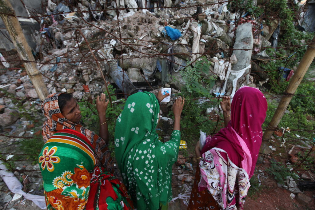 Relatives of the dead workers visit the Rana Plaza site every day in Savar, Bangladesh. While they remember their lost loved ones, the labels of well-known clothing brands are easy to find in the rubble next to them.