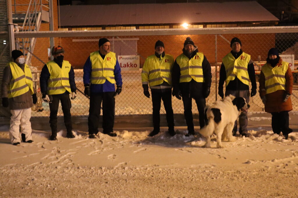 Фото: Бастующие работники у проходной фабрики UPM Kymi в Коуволе 1 января. Автор: Хенри Коскела, один из участников забастовки и член профсоюза.