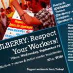 Примите участие в акции в Интернете (#Justice4MulberryWorkers) или в магазине Mulberry, расположенном недалеко от вашего места жительства, и потребуйте, чтобы бренд элитной одежды и кожаных сумок действовал в соответствии со своими собственными 'Глобальными принципами поиска поставщиков'.