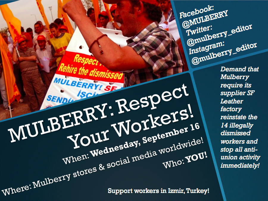10 сентября, 2015На 16 сентября намечено проведение Глобального дня действий в защиту работников, уволенных турецкой компанией SF Leather, поставщиком английского производителя изделий из кожи Mulberry. Работники пострадали из-за вступления в профсоюз.