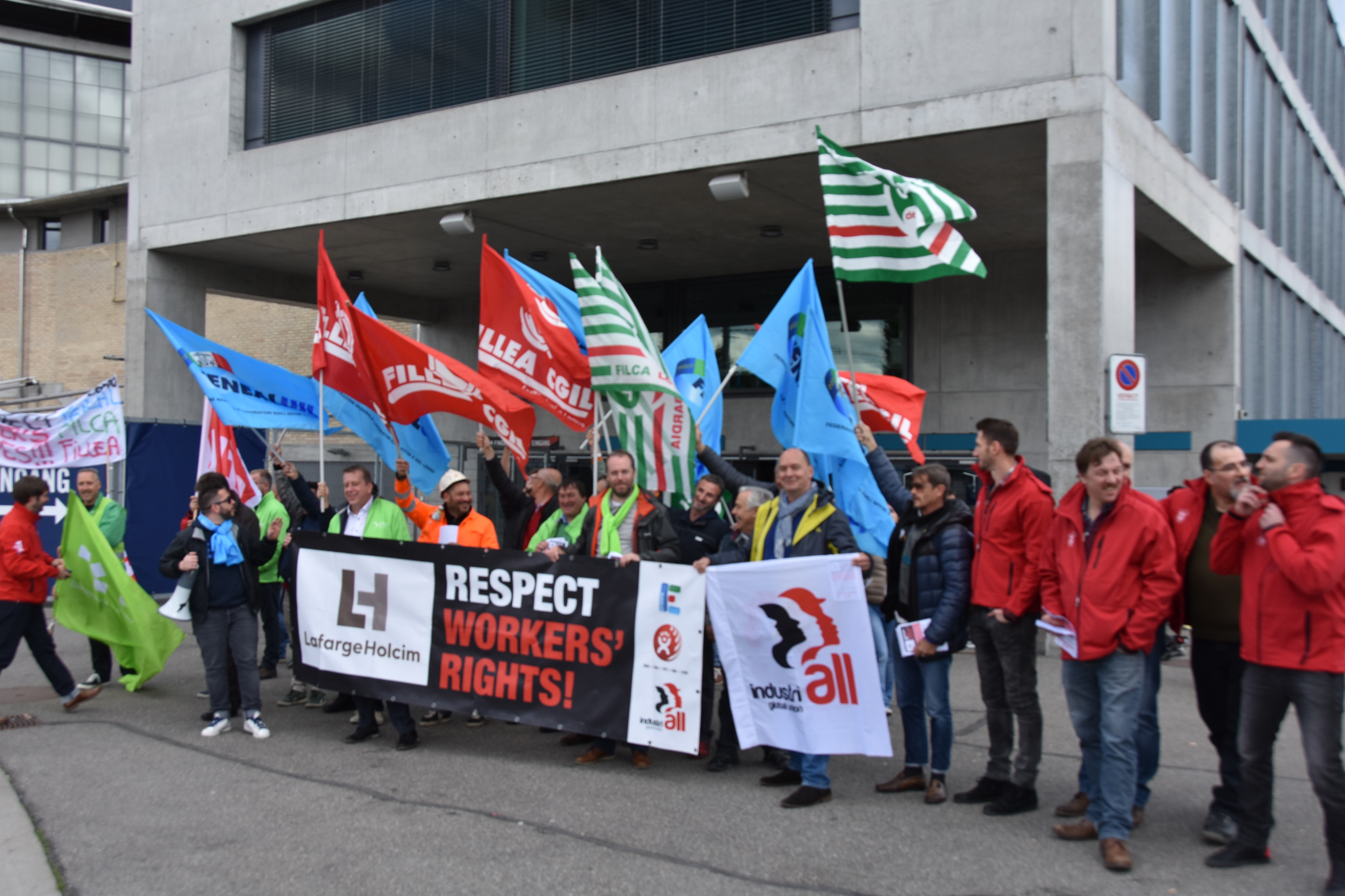 Около 40 активистов из Италии, Бельгии, Германии, Австрии, Швейцарии и Франции, а также представители IndustriALL и BWI собрались перед входом в Hallenstadion в Цюрихе, Швейцария, чтобы встретиться с акционерами LafargeHolcim и сообщить им о ведущихся в настоящее время переговорах о подписании ГРС, заявив о своей поддержке. Распространяя листовки среди участников собрания, представители профсоюзов объяснили цель своего визита.