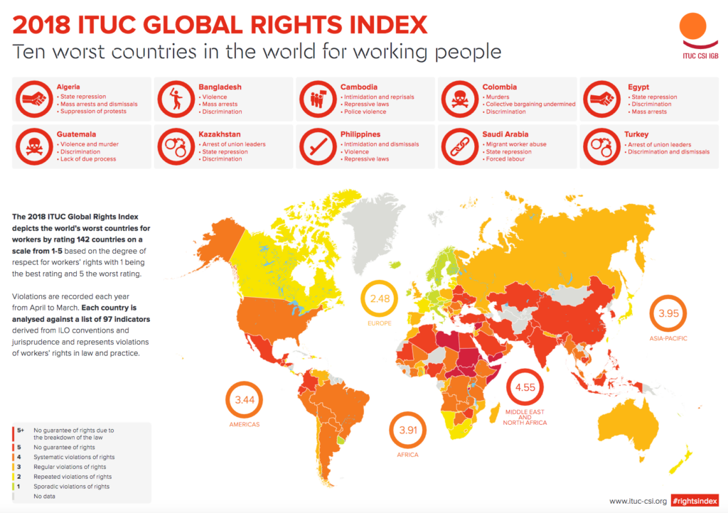 Глобальный индекс МКП по правам трудящихся 2018 ранжирует 142 страны по 97 показателям, признанным на международном уровне, чтобы оценить, в каких странах права трудящихся защищены лучше всего, как на уровне законодательства, так и на практике.