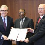 Пабло Исла (Inditex), Мусса Умару (МОТ) и Вальтер Санчес (IndustriALL) во время подписания ГРС в штаб-квартире МОТ, ноябрь 2019 года.