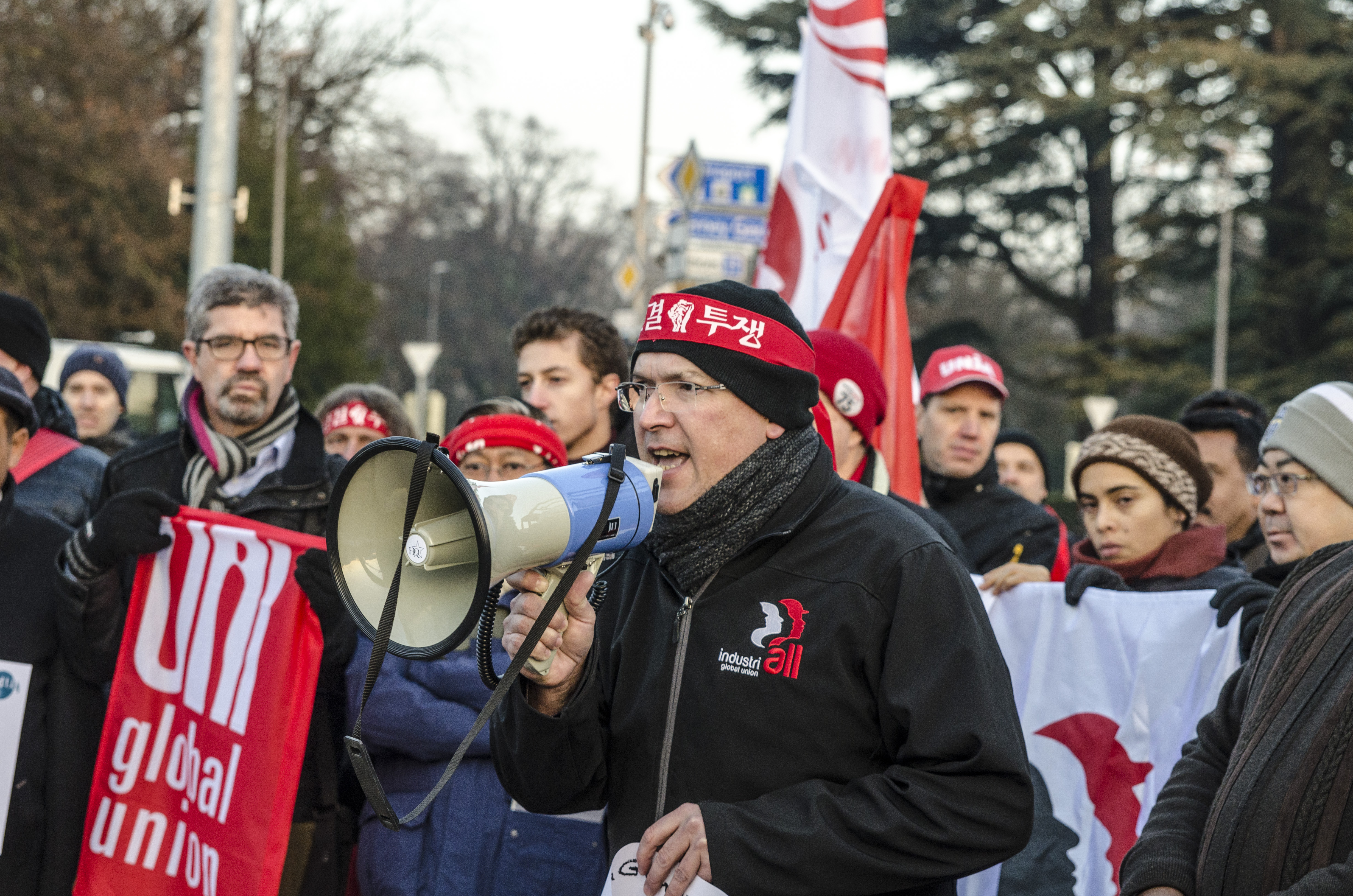 Обеспокоенные ликвидацией прав, которыми пользовались работники в Корее последние несколько лет, около ста представителей глобальных союзов прошли маршем по улицам Женевы к зданию постоянного представительства Кореи, чтобы передать письмо послу.