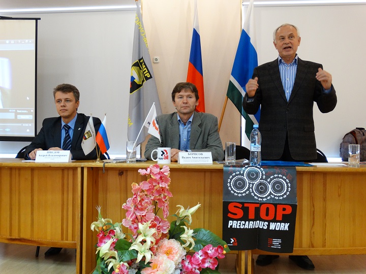 Представитель Глобального союза IndustriALL Вадим Борисов дал информацию о подготовке профсоюзов всего мира ко Дню единых действий против заемного труда и призвал членские организации ГМПР активно участвовать в акциях 7 октября. Он также сообщил, что для лучшего освещения в профсоюзных СМИ подготовки ко Дню единых действий на сайте IndustriALL размещены только что переведенная на русский язык брошюра ПЕРЕГОВОРЫ О ГАРАНТИЯХ , а также макет плаката НЕТ ЗАЕМНОМУ ТРУДУ!, которые можно скачать и использовать в мероприятиях на местном уровне.
