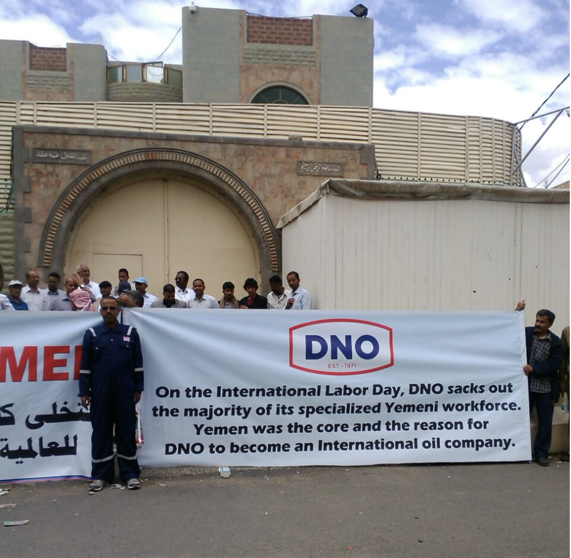 Согласно законодательству Йемена, если компания получает лицензию на эксплуатацию нефтяного месторождения, она должна выплачивать зарплату работникам и выполнять социальные обязательства в течение всего срока действия лицензии. DNO под предлогом войны и политической ситуации в Йемене решила уклониться от ответственности перед своими работниками, прекратив деятельность 27 апреля 2015 года. Компания не выплатила работникам ни выходного пособия, ни компенсации, лишив их социально-экономических гарантий в стране, находящейся на грани краха.