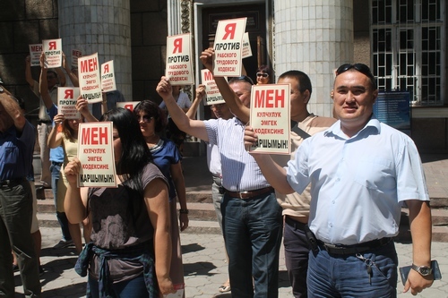 3 июля, 20152 июля около 50 профсоюзных активистов провели флешмоб перед зданием Министерства экономики Кыргызстана, молча держа в руках плакаты с надписью «Я против рабского Трудового кодекса».
