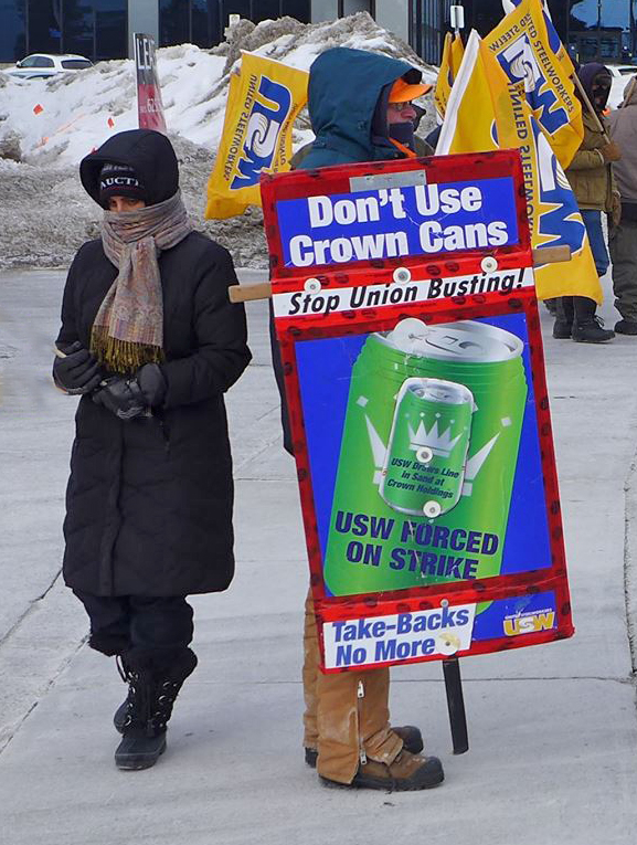 120 работников завода Crown Holdings в Торонто, Канада, которые когда-то, все без исключения, были награждены высшей наградой компании за “преданность, усердие и личную ответственность”, в настоящее время вот уже 17 месяцев бастуют. В сентябре 2013 года работники были вынуждены объявить забастовку после того, как руководство Crown потребовало от них огромных уступок, в том числе 42-процентного уменьшения заработной платы для новых работников и постоянного снижения шкалы заработной платы, пытаясь получить еще большую прибыль за счет работников.