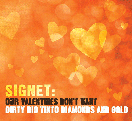 В этом году в преддверии Дня Святого Валентина Глобальный Союз IndustriALL, Лондонская горнодобывающая сеть, общественная организация Earthworks и LabourStart призывают крупнейшего в мире ювелирного ритейлера Signet потребовать у своего основного поставщика алмазов и золота, транснациональной горнодобывающей компании Rio Tinto, ответственно вести свой бизнес – уважать права работников и коренного населения и заботиться об окружающей среде.