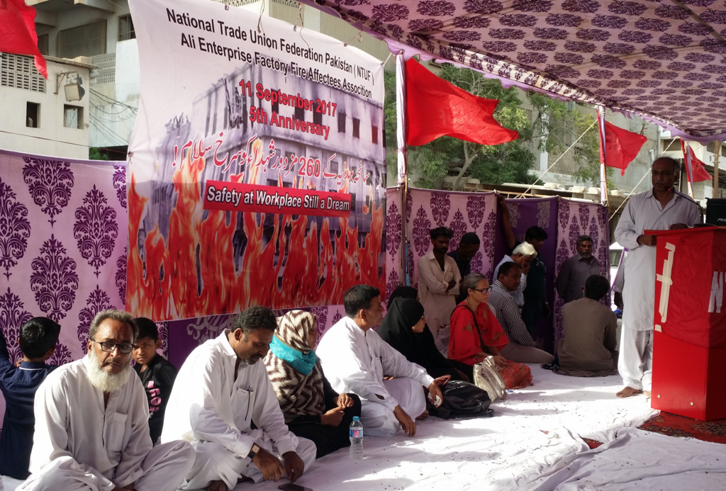 11 сентября члены Ассоциации пострадавших во время пожара на фабрике Ali Enterprises (AEFFAA) и Национальной федерации профсоюзов (NTUF) собрались около здания фабрики, на которой пять лет назад произошел пожар.