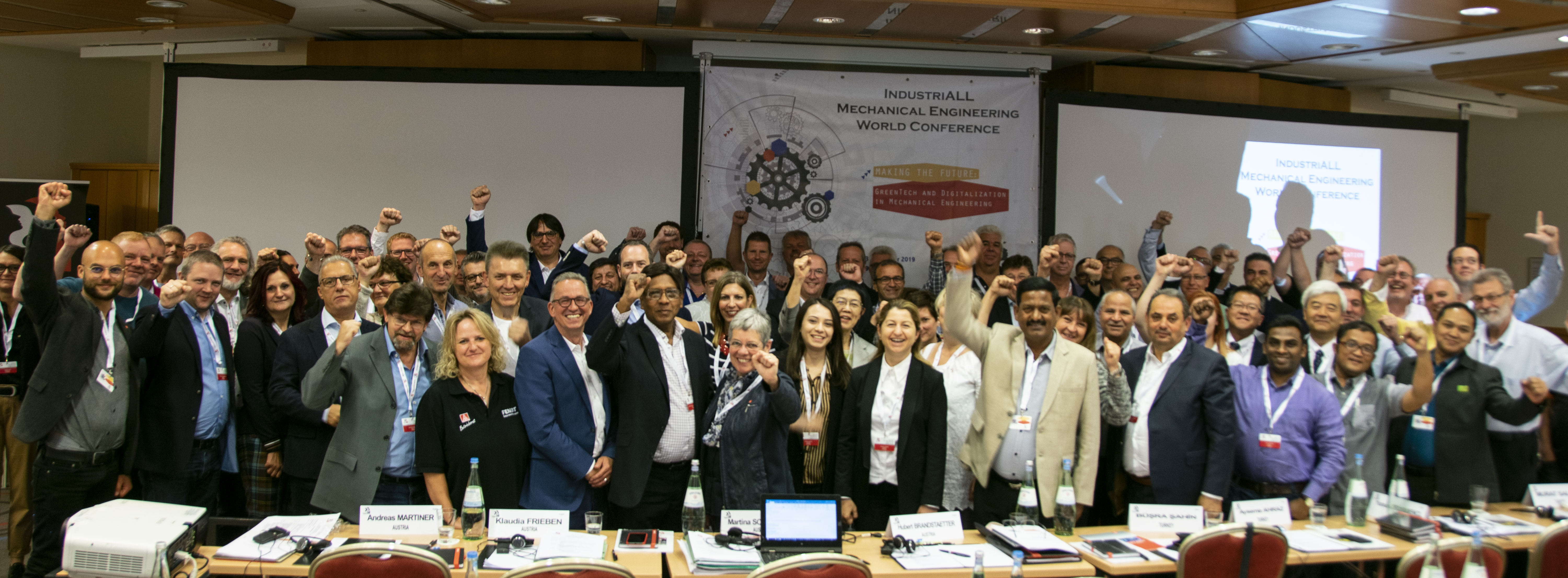 “Мы, 90 участников из 19 стран, солидарны с бастующими рабочими Riva”.