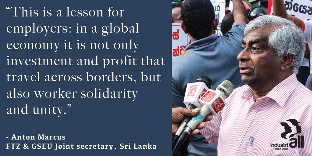 На этой неделе Глобальный союз IndustriALL празднует большую победу, одержанную рабочими в борьбе с транснациональной компанией, которая безуспешно пыталась избавиться от профсоюзов на двух своих заводах в Шри-Ланке.