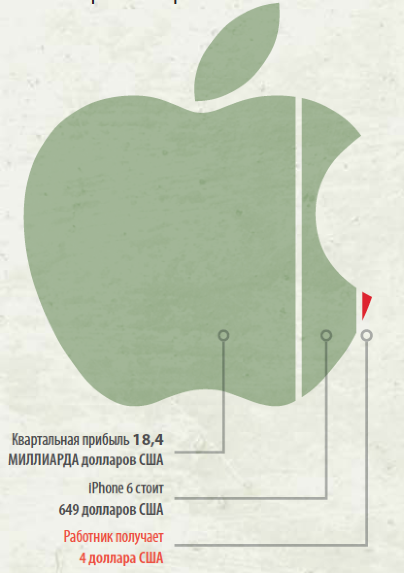 В последнем квартале 2015 года компания Apple сообщила о самой большой квартальной прибыли, когда- либо полученной корпорацией: 18,4 миллиарда долларов США. Денежные резервы компании составляют 216 миллиардов долларов США. При этом работники, которые создают изделия, приносящие столь беспрецедентную прибыль, получают всего 4 доллара США за изготовление iPhone 6, который в США продается в розничных магазинах за 649 долларов.