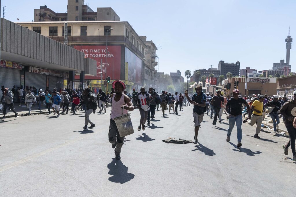 Photo: © Ihsaan Haffejee, New Frame: 2 September – People run away from the police who tried to disperse a mob attempting to loot migrant owned businesses