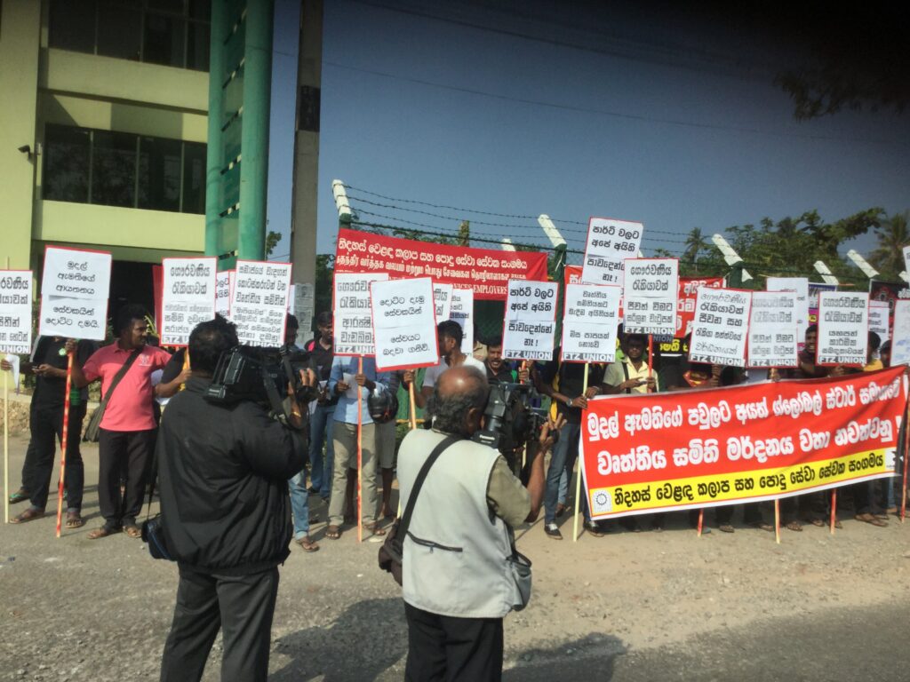 The next day, as a meeting with the Negombo labour official to resolve the dispute was in progress, in a blatant attempt at intimidation, picketing workers were detained by police for allegedly possessing explosive materials. They were released after the intervention of a FTZ & GSEU representative.