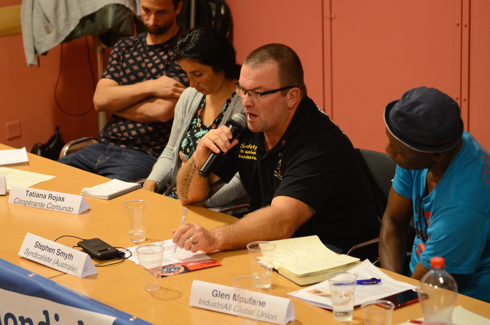 Stephen Smyth of the CFMEU in Australia and Glen Mpufane of IndustriALL at an event in 2018