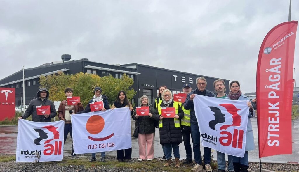The picket line outside Tesla garages are manned not only by striking Tesla workers, but workers from companies with collective agreements with IF Metall. In a show of solidarity, IndustriALL and ITUC visited the striking workers in Gothenburg earlier this month.