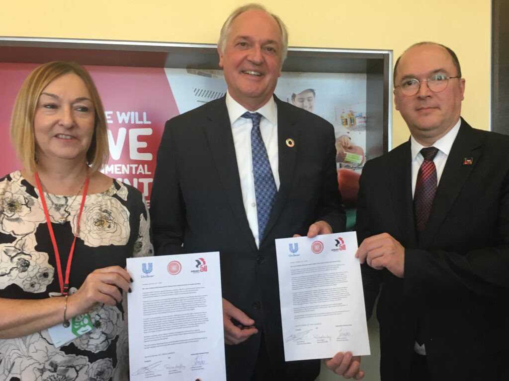 The Memorandum was signed by Unilever’s chief executive officer Paul Polman, IndustriALL Global Union general secretary Valter Sanches and IUF general secretary Sue Longley in London on 31 October 2018.