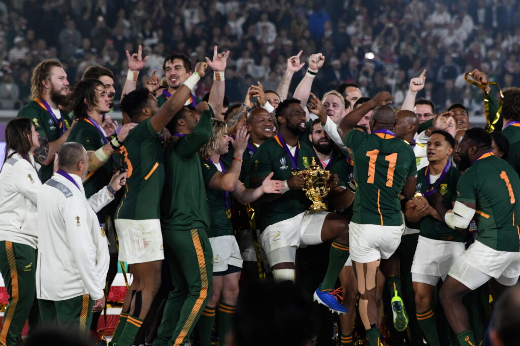 Photo credit: The South African rugby team celebrates. Photo: GCIS/South African Government