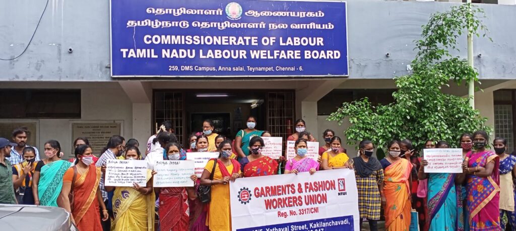 The management of SLAM Clothing, which has a factory near Chennai, locked out workers to stop workers from entering the factory following the union’s demand for the payment of outstanding wages. Instead of engaging with the union or approaching the government for permission to close the factory as is required under law, the management chose to block workers from entering the factory. This means the factory was unilaterally shut by the management who also forged workers’ signatures on the resignation letters.