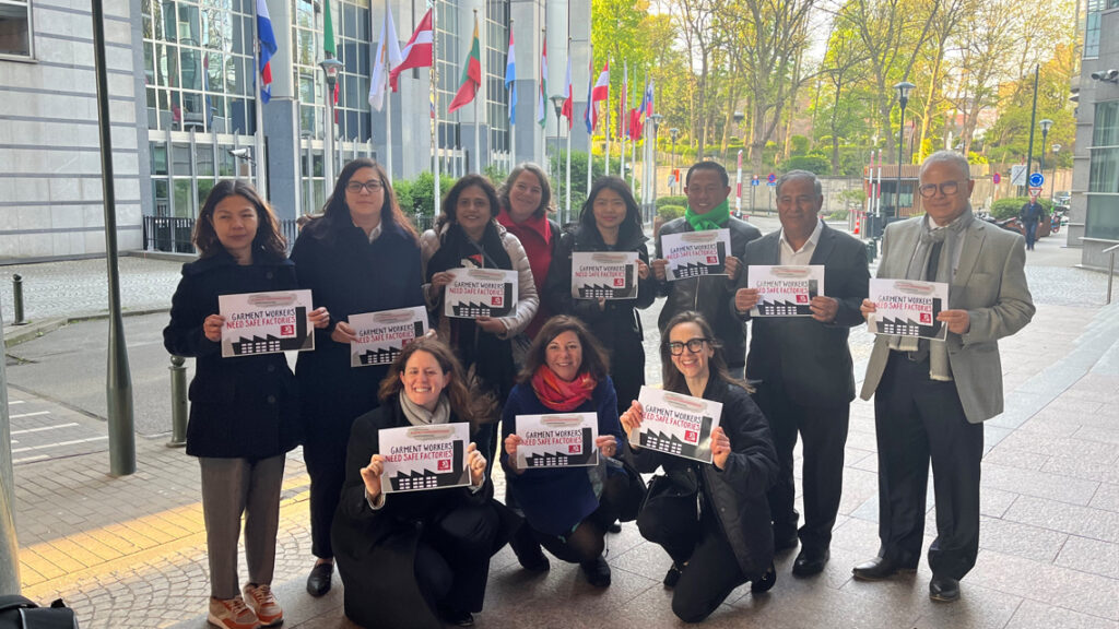 4 May, 2023The 10th anniversary of the Rana Plaza collapse on 24 April was the starting point of a week-long advocacy with garment union leaders from Bangladesh, Myanmar, Cambodia and Tunisia. The delegation met with the ILO in Geneva, politicians in Berlin and the EU Parliament and Commission in Brussels to discuss the continued campaign on safe factories and the need for mandatory due diligence.