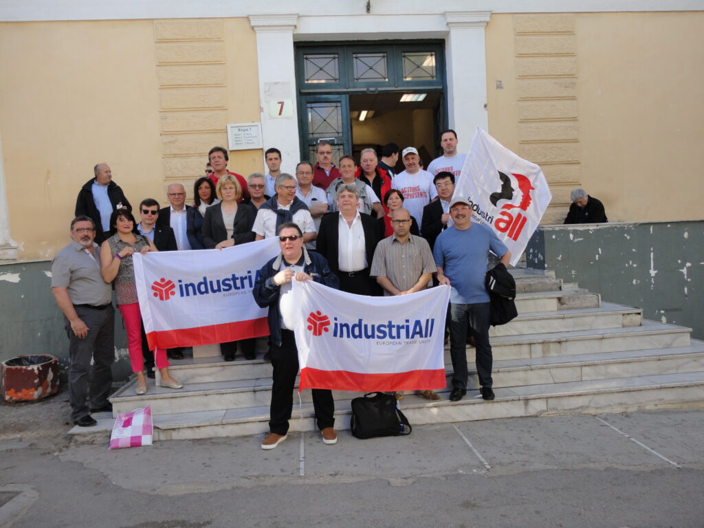 The Greek metalworkers’ union, POEM, is celebrating a well-earned victory after a verdict was finally handed down in the Skaramanga Shipyard court case on 5 May: 11 of 12 imprisoned trade unionists were set free immediately and one received a 6 month suspended sentence. The verdict came after a two-year struggle by the trade unions supported by a European-wide solidarity campaign. A delegation of representatives from sister organization industriAll European Trade Union and IndustriALL Global Union was in the Athens court on Monday to show our continued support.