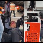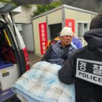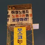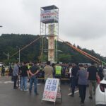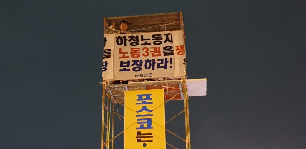 The following day, FKMTU secretary-general Kim Jun-yeong joined the sit-in protest on a makeshift scaffolding, seven metres above ground. At dawn, four police officers approached Kim with a mobile crane, striking Kim Jun-yeong with a long stick until he fell down from the scaffolding. Kim suffered severe injuries to his forehead and head, a fractured knee and bruises all over his body. He was taken into police custody.