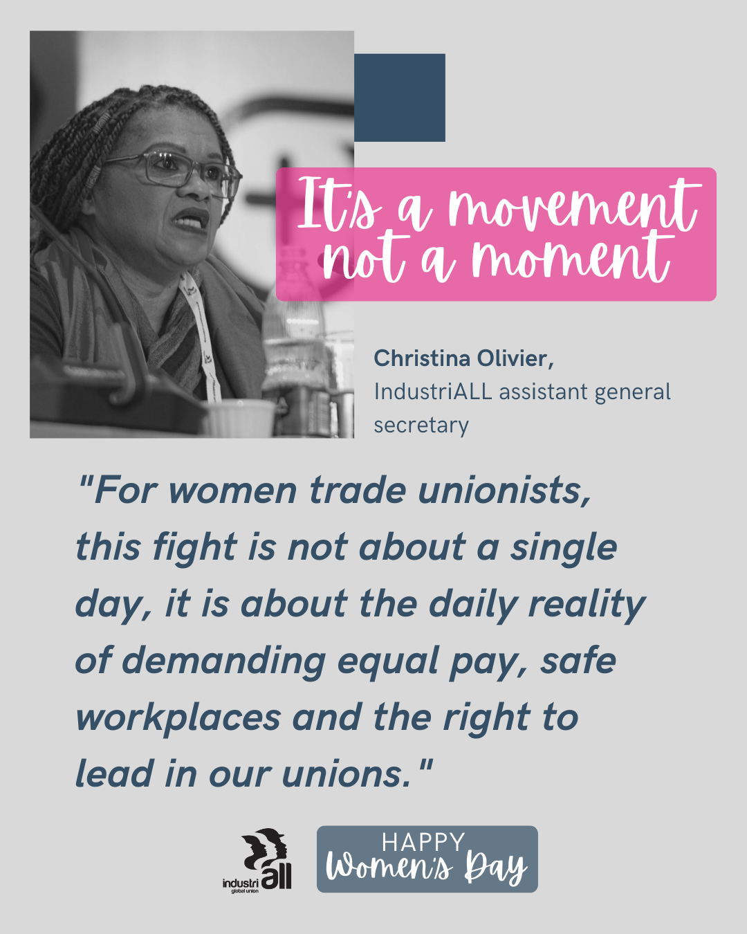 We reached out to women in IndustriALL's networks throughout many of our sectors, asking questions to women in leadership and women who have been mentored by IndustriALL's women leaders. The responses came pouring in, so many that we couldn’t showcase them all on Women’s Day. So be sure to stay tuned to hear from the many voices of women of IndustriALL, because, in the words of Christina Olivier, this is a movement, not a moment. We don’t need a specific day to share this—we will just keep it coming.