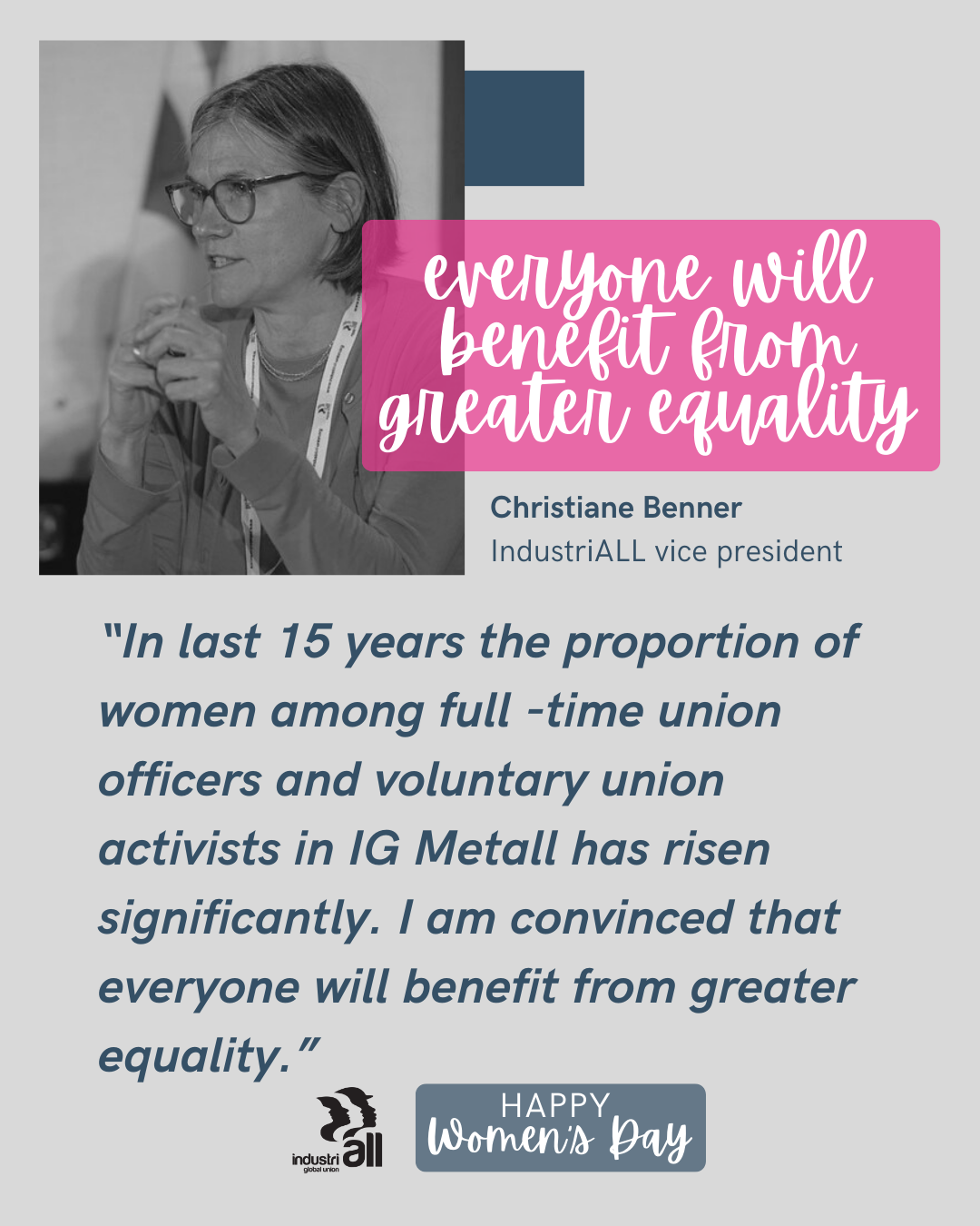 As part of the global actions marking International Women's Day, Christiane Benner, vice president of IndustriALL and president of German union IG Metall, delivered a powerful video message emphasizing the ongoing struggle for gender equality. She highlighted key achievements, including increased representation of women in union leadership, collective bargaining wins for work-life balance, and structural changes within IG Metall to support women in traditionally male-dominated industries. Benner’s message reinforced the importance of collective action in shaping a more inclusive and equitable future for all.