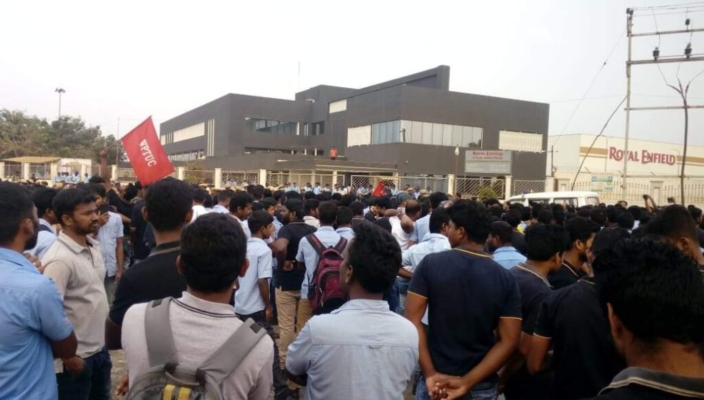 18 February, 2019Workers at the Royal Enfield motorcycle factory in Oragadam, Chennai, India, took part in protest action after management undermined unionization efforts by transferring union office bearers and active members across India on 12 February.